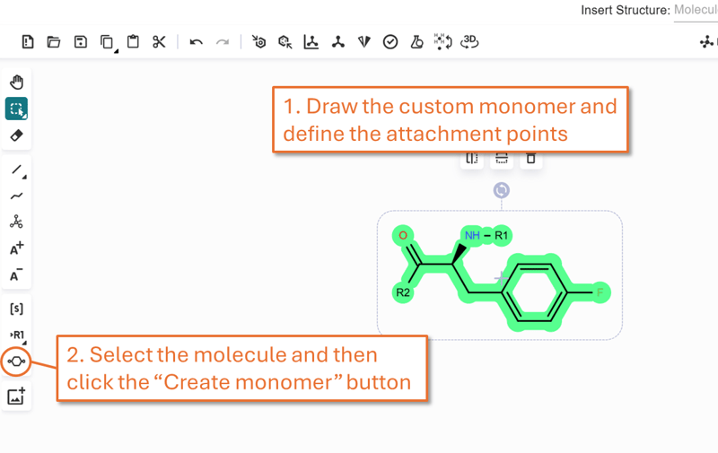 Custom monomers registered in CDD Vault are automatically added to the custom monomer library within the structure editor and can be used to create macromolecules.