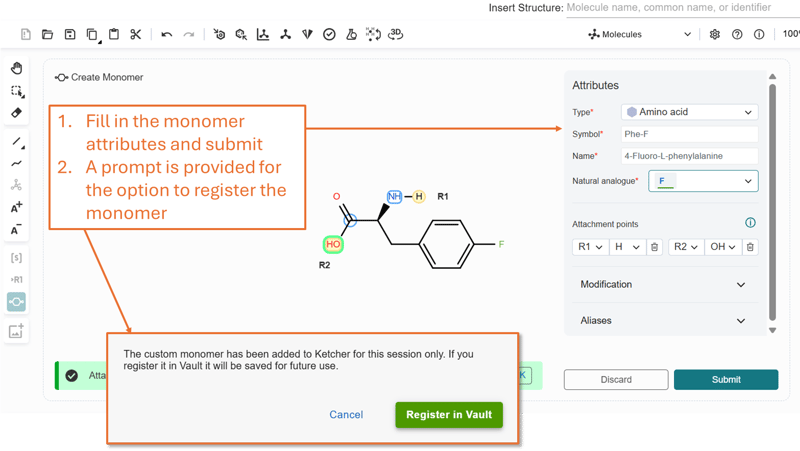 In the structure editor, draw your custom monomer and choose to register that monomer as a new molecule in CDD Vault directly from the canvas.
