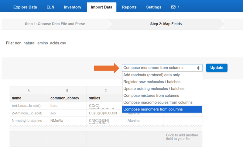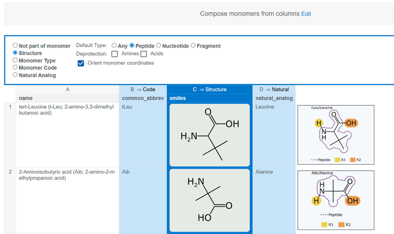 Custom monomers can be registered in bulk in a similar process to molecule registration. Using an excel or csv file, choose the option to ‘Compose monomers from columns’ in Step 2 of the Import Data wizard.