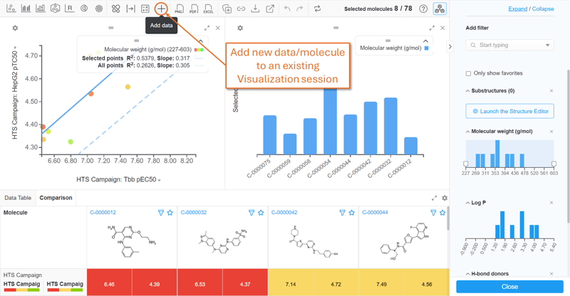 After configuring a Visualization session, add new protocol data and molecules by using the plus sign icon at the top of the page. Previously, users would need to perform a new search, and relaunch an entirely new Visualization session to add data that either didn’t match the original search criteria or wasn’t included using Customize your Report. This feature is only available for Visualization sessions originating from a Vault search, not from a standalone session using a data file.