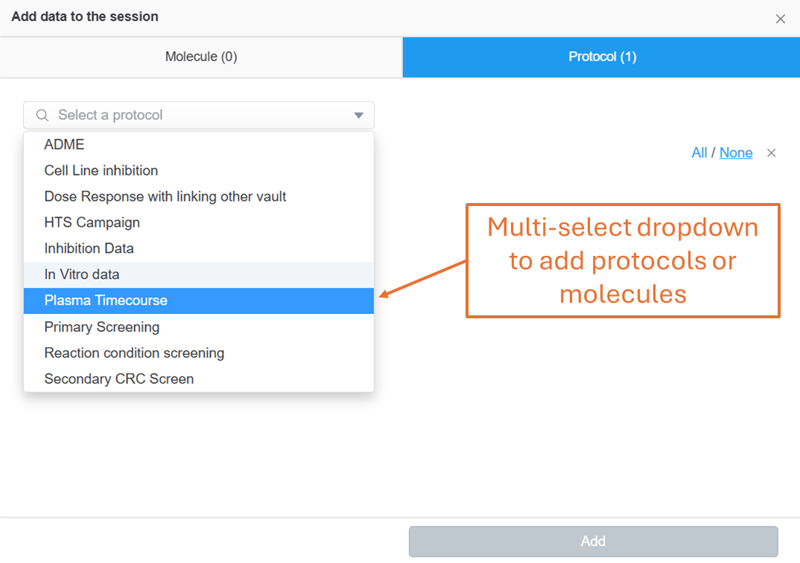 Multiple molecules or protocols can be added at once by selecting the desired options in the dropdown menu. Using the table settings, users can then customize which columns are displayed from the newly added fields.