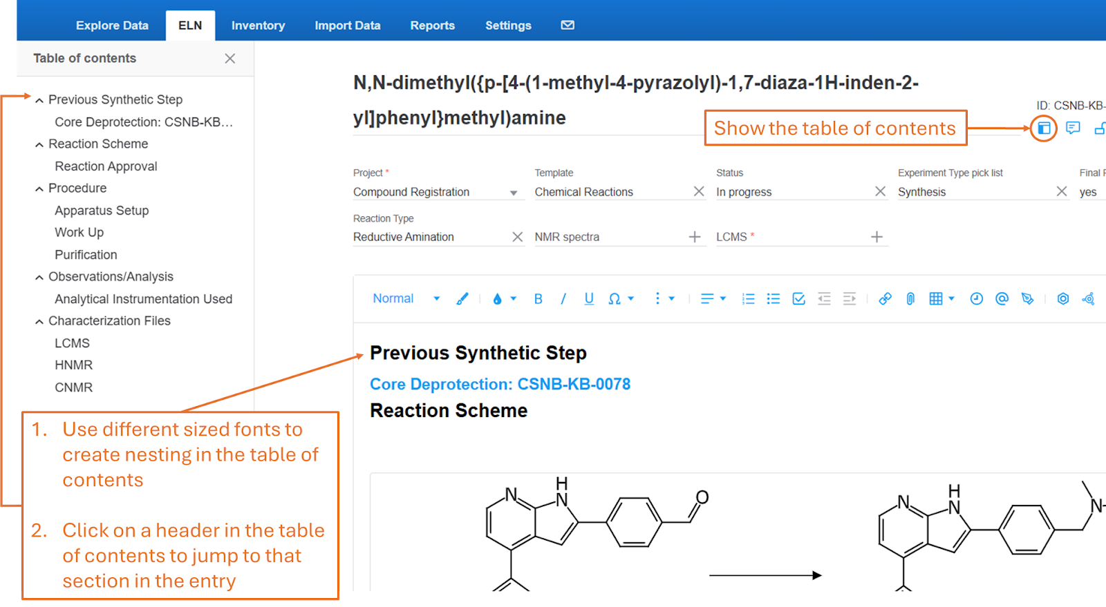 Create a table of contents by using the available headers (heading 1-3) in the body of a notebook page. Click the icon to display the table of contents and jump to a certain section of the entry by clicking on a header. Hover over a header name and use the copy url icon to grab a direct link.