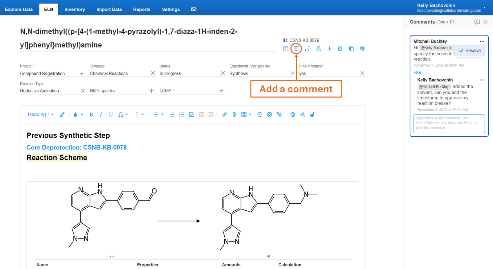 Authors and other users with access to a notebook entry can add comments to the side of the page without editing the body of the entry. Highlight text to add a comment for a specific part of the notebook entry or add a general comment using the icon in the sidebar. Resolve comments by clicking the ellipse symbol on the top right corner of the comment. Email notifications for @ mentions in comments are coming soon.